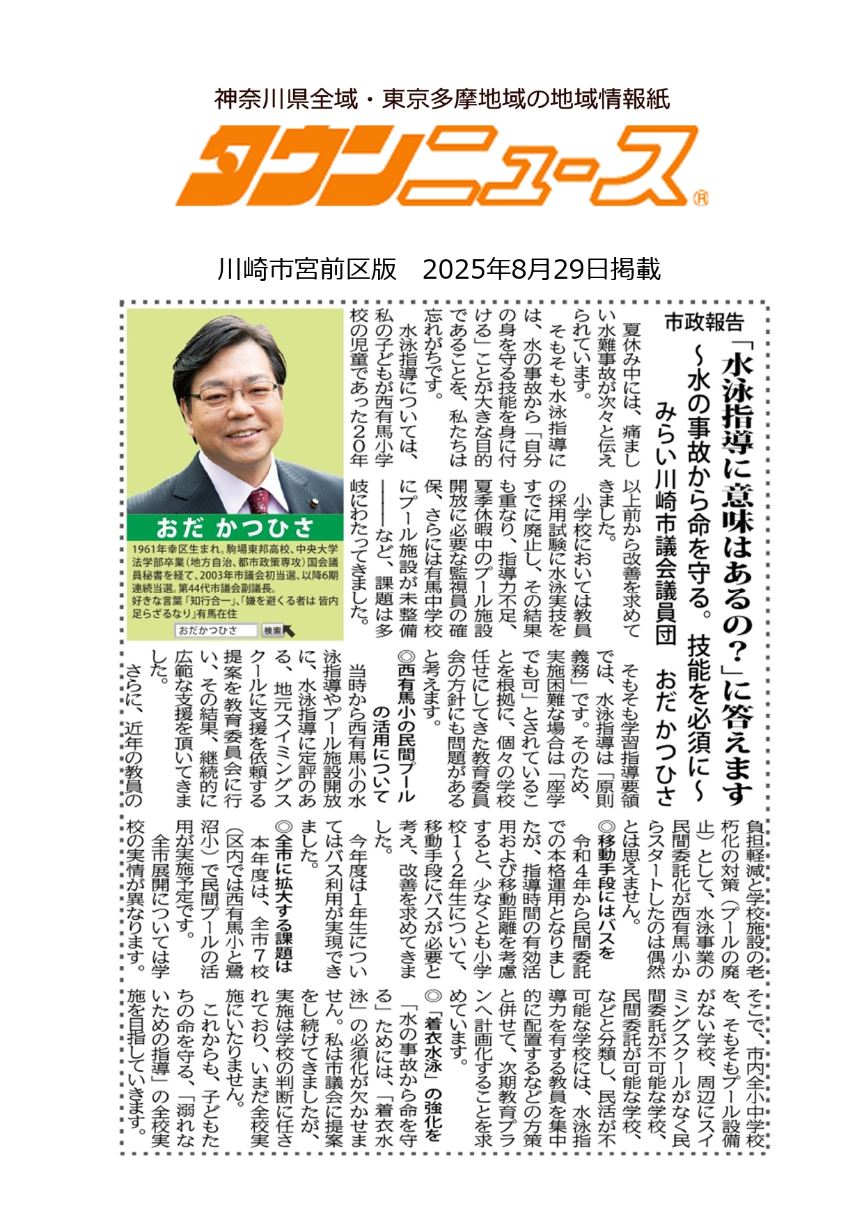 「水泳指導に意味はあるの?」に答えます(タウンニュース記事)