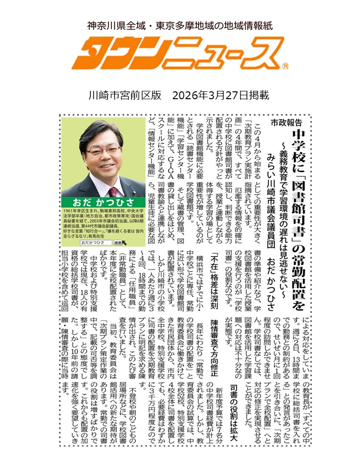 中学校に「図書館司書」の常勤配置を(タウンニュース記事)